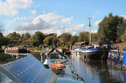 The view from the bridge back towards the lock. Its not far up to the shops and milk and papers. Workboats looking sad for being stuck here :-)